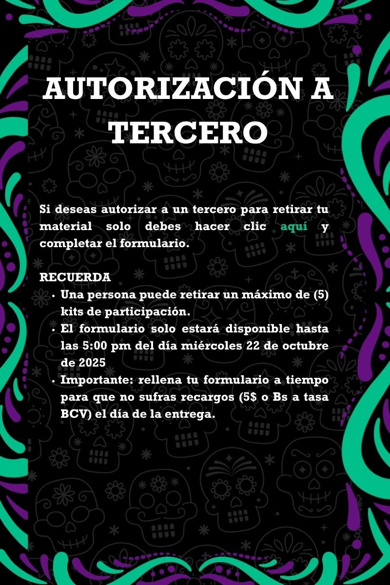 En caso de que el corredor no pueda asistir a retirar el material debe autorizar a un tercero, para ello, deberá completar el formulario “AUTORIZACIÓN A TERCERO” que se encuentra ubicado en el site del evento.