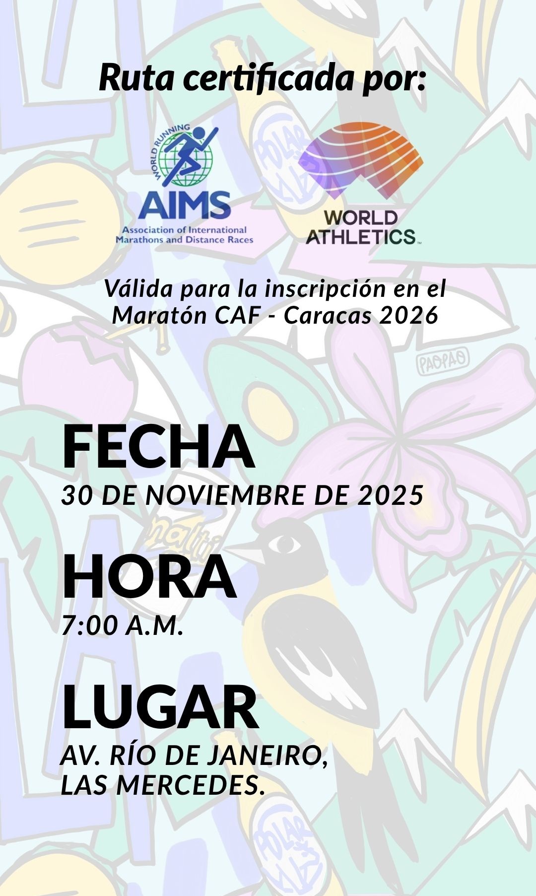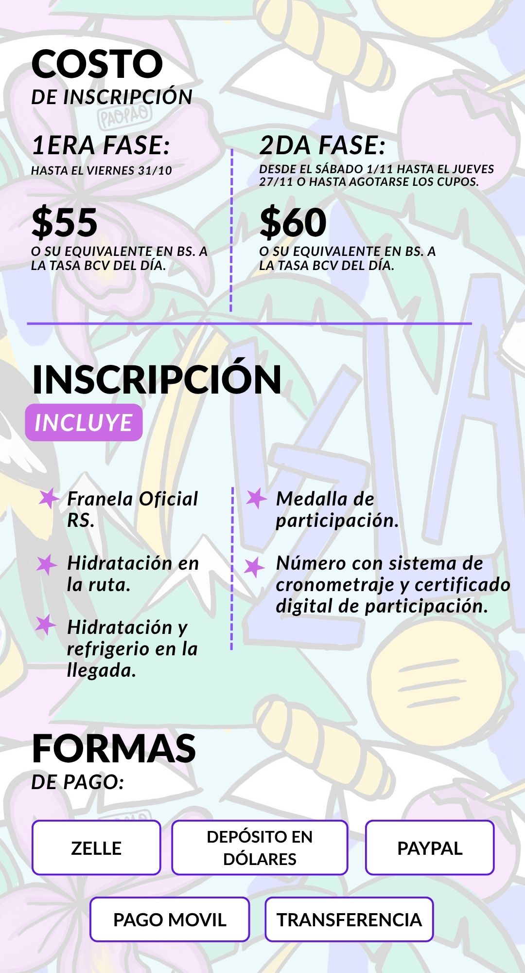 El número (dorsal) y franela oficial del evento será entregados únicamente presentando el documento de identificación oficial (cédula o pasaporte) del participante inscrito.