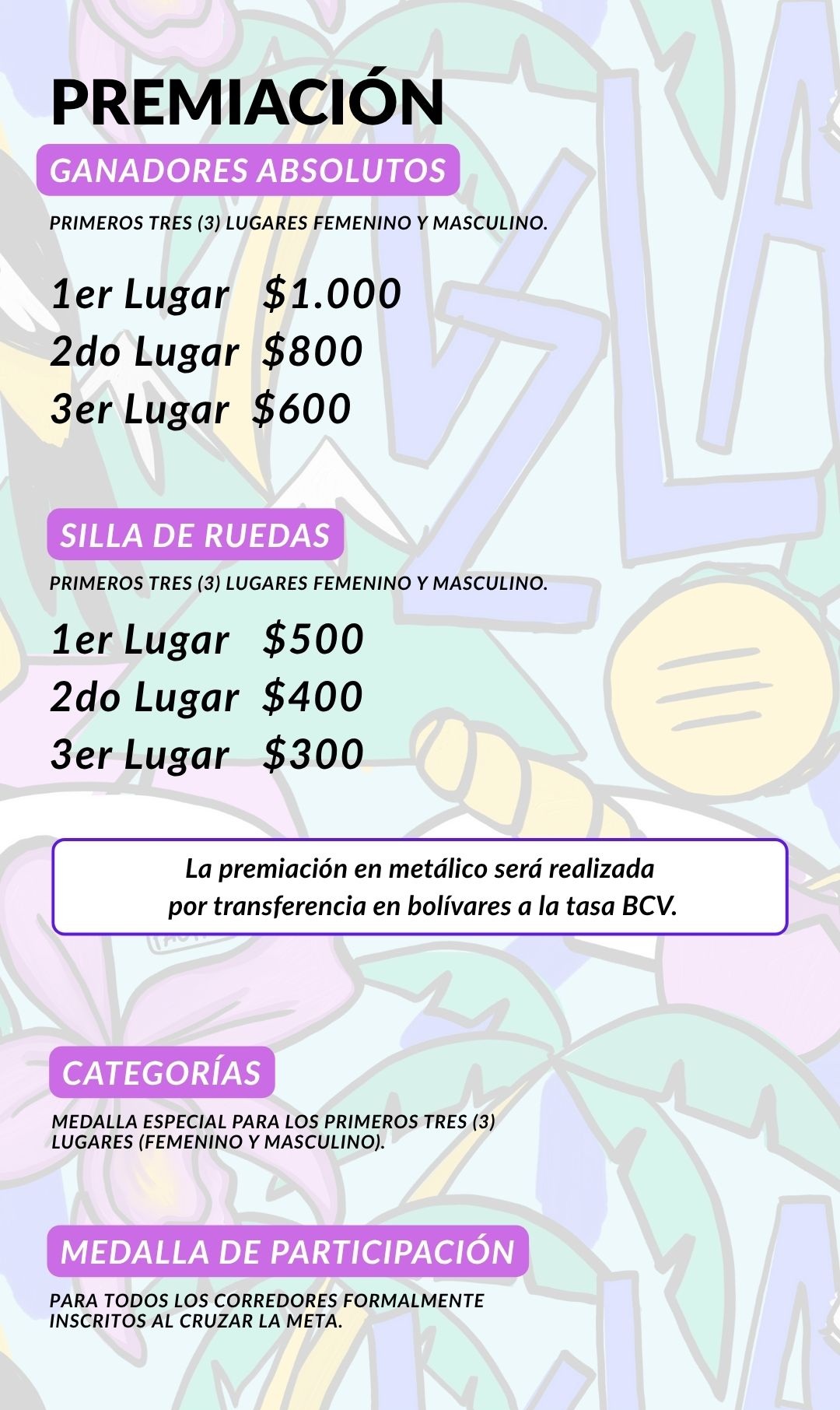 La premiación en metálico será transferida en Bs según la tasa de cambio oficial del BCV el mismo día del evento o el lunes siguiente al mismo, una vez que los ganadores suministren los datos bancarios. De no suministrar los datos bancarios en el tiempo establecido, el ganador renuncia al derecho a reclamar la premiación.