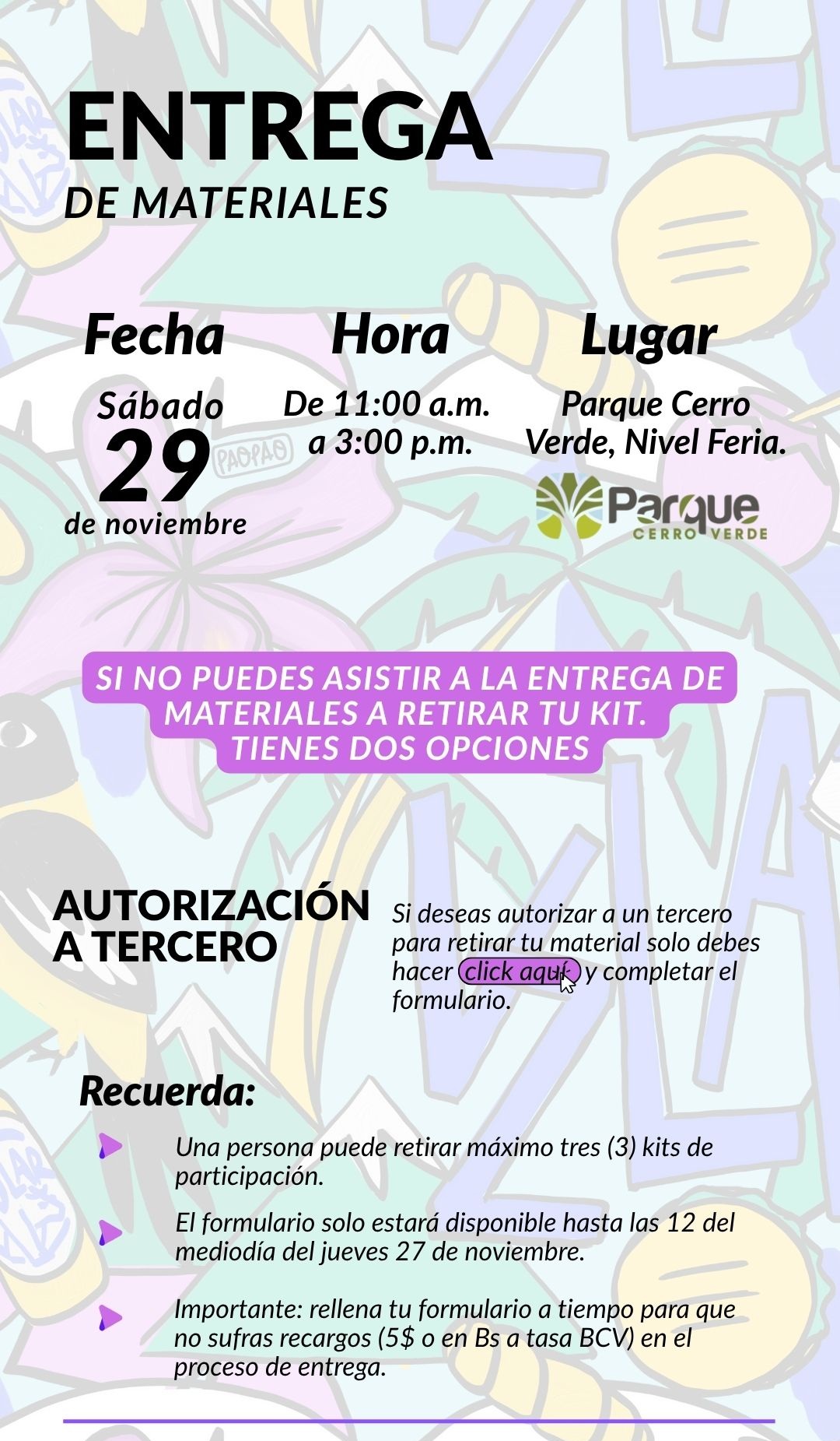 Aquel corredor que no pueda asistir a la entrega de materiales tendrá la posibilidad de seleccionar al momento de inscribirse la opción “RETIRO EN LA CARRERA” que se encuentra ubicada en la planilla de inscripción, tiene un costo adicional de 10$ o su equivalente en Bs a tasa BCV.