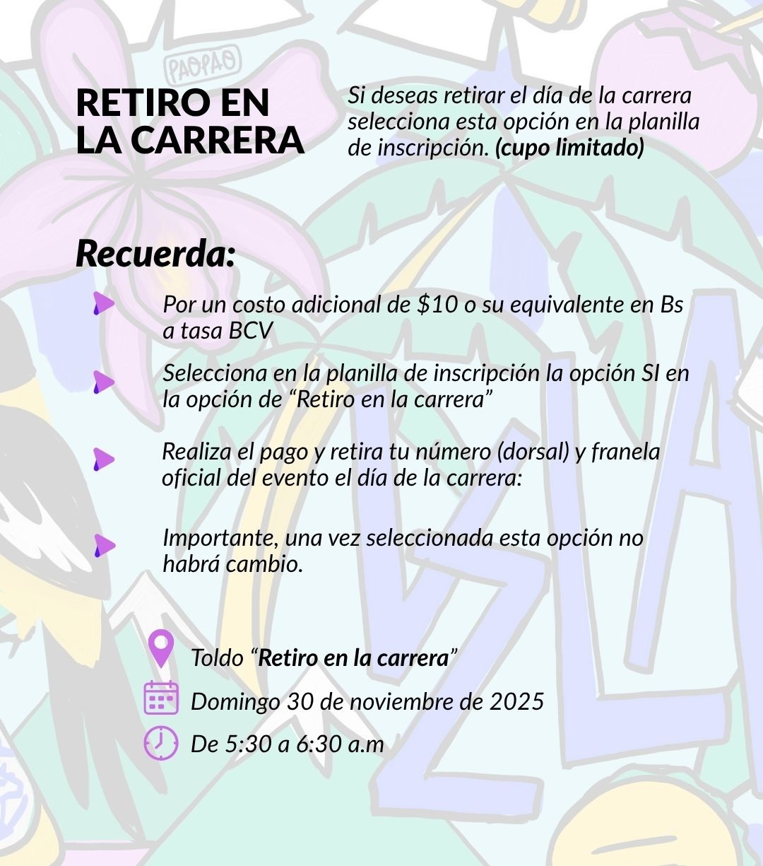 El momento de retiro de número (dorsal) y franela oficial del evento será única y exclusivamente los días dispuestos por la organización. Posterior a esa fecha y horario, no se realizará entrega de material bajo ningún concepto, ni se reintegrará el dinero de la inscripción.