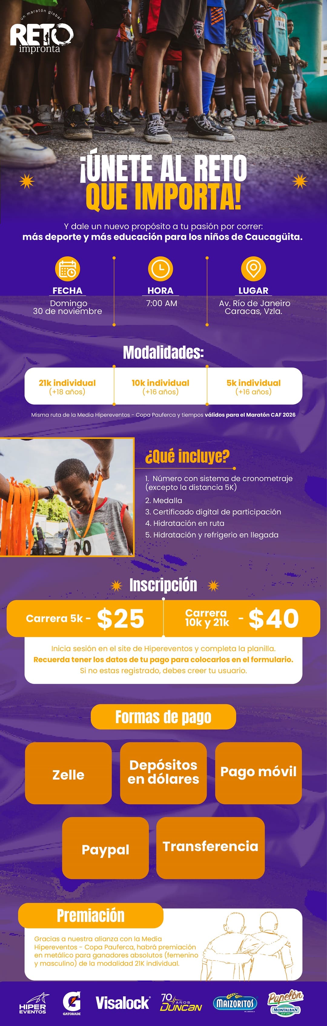 Fundación Impronta en alianza con Hipereventos, C.A. organiza el 30 de noviembre de 2025, la 6ta edición de su Reto Impronta, con salida a las 7:00 a.m.