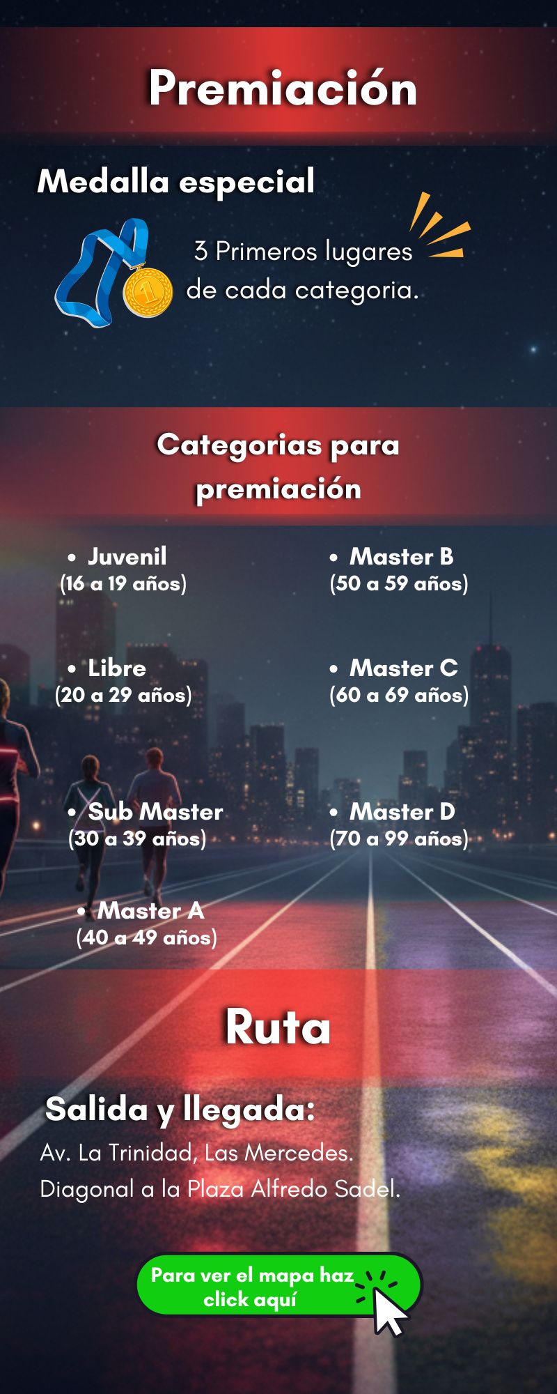 El cronometraje se realizará mediante sistema de TAG (Chronotrack) adosado en la parte posterior del número (dorsal), por ende, es obligatorio su uso correcto colocándolo en la parte frontal de su franela de manera visible, quien no utilice el dorsal correctamente, no tendrá derecho a tiempo, premiación, ni a acceder al embudo de llegada.