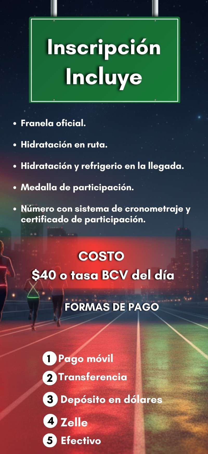 El número (dorsal) y franela oficial del evento será entregados únicamente presentando el documento de identificación oficial (cédula o pasaporte) del participante inscrito.