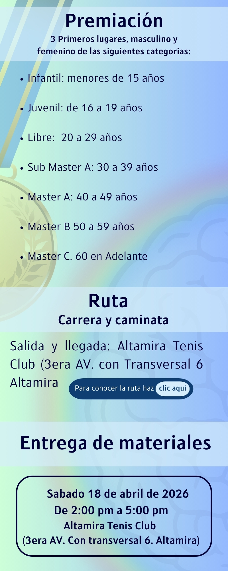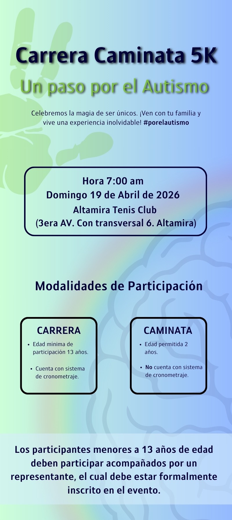 1. Fundación Autismo en Voz Alta en alianza con Hipereventos, realiza la XV edición de la carrera/caminata 5K Un paso por el Autismo, el Domingo 19 de abril de 2026, en las inmediaciones del Altamira Tenis Club a las 7:00 a.m.